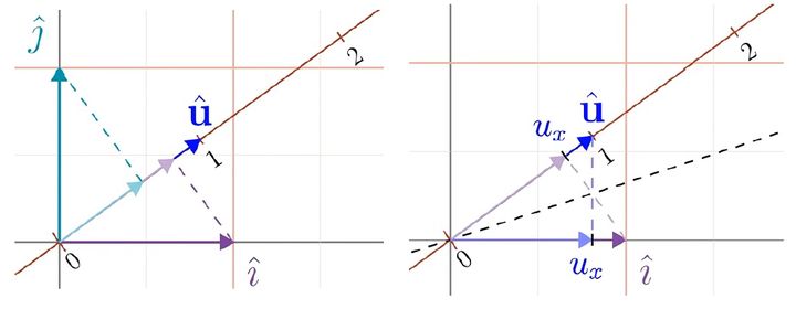 重新认识一下这种运算,在二维空间中沿着某方向放置一条数轴,数轴的基向量设为$\hat{u}$。我们将空间中的向量投影到这条直线上,可表明这个操作是线性的,因为它满足等距分布的点在投影之后仍是等距分布。